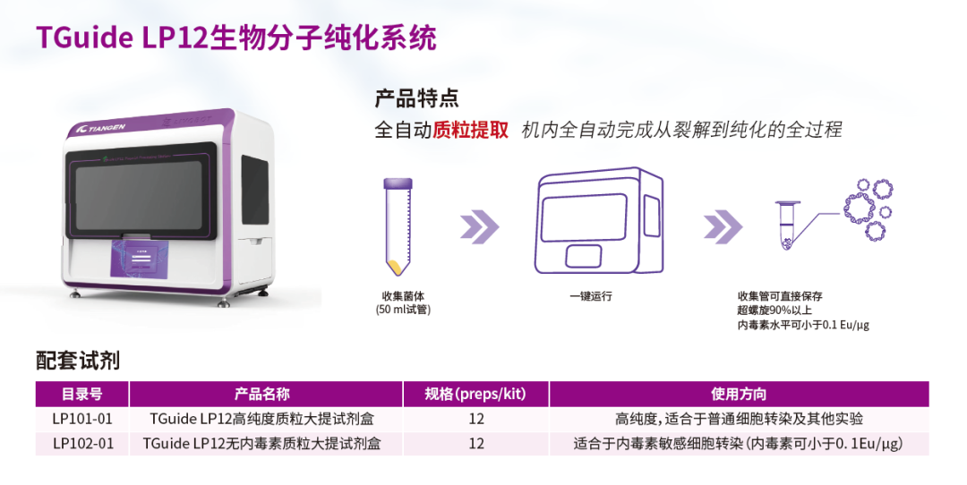 TIANGEN携全自动质粒大提产品解决方案(TGuide LP12生物分子纯化系统)亮相GRi论坛。TGuide LP12基于磁珠法提取核酸原理,搭配单通道移液枪和12通道移液枪全自动完成从菌体沉淀上机后的质粒提取流程,一体机运行中途无需人工介入,提取产物自动存储于1.5/2.0 ml收集管中,收集管可直接保存,超螺旋90%以上,内毒素水平可小于0.1EU/μg。