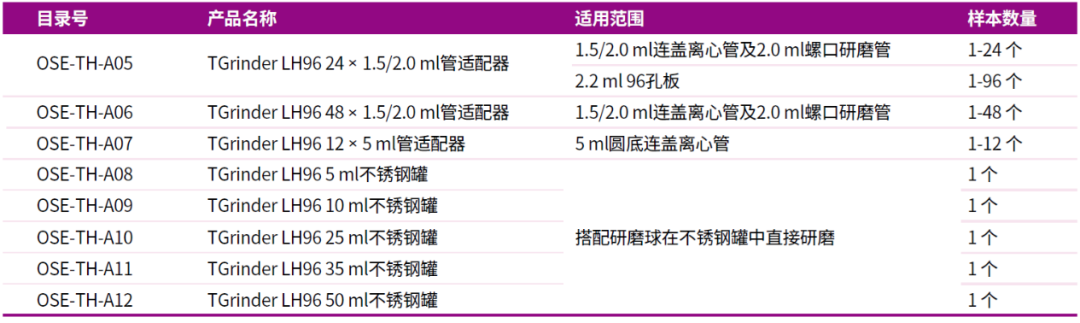 搭配不同适配器及耗材实现24、48或96个样本同时研磨。