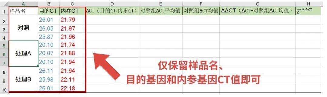 整理qPCR数据,仅保留样品名、目的基因和内参基因CT值即可。