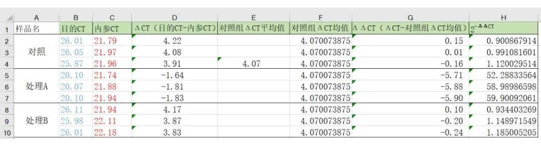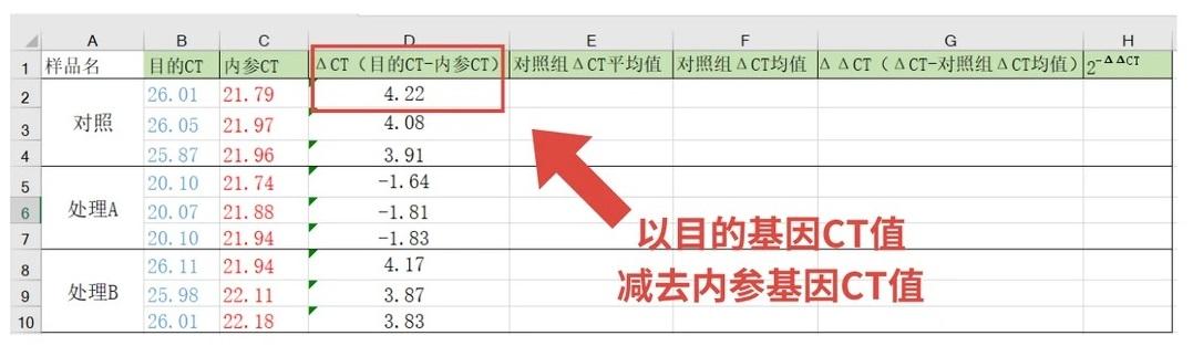 ΔCT = 目的基因CT值 - 内参基因CT值