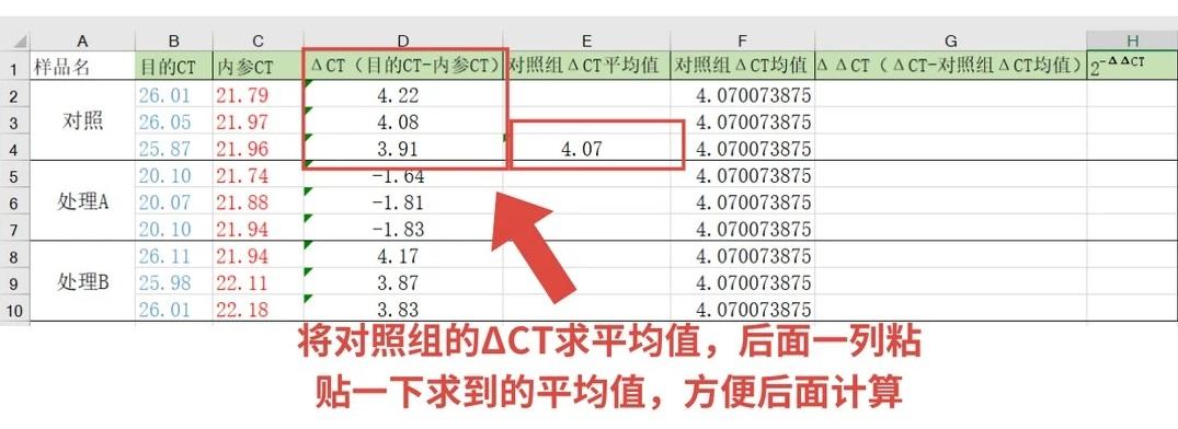 将对照组的ΔCT求平均值,复制粘贴到后面一列,便于后续计算。
