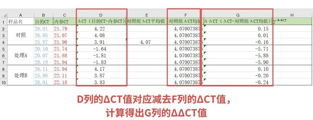 ΔΔCT = ΔCT - 对照组ΔCT均值