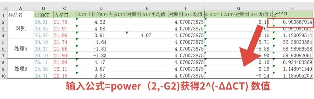 其中G2为ΔΔCT值所在的单元格